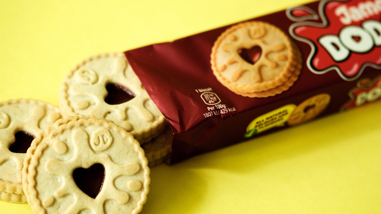 It sounds like a name out of a children's book (or the Artful Dodger in "Oliver Twist"), but a Jammie Dodger is actually a type of jam-filled cookie that is beloved throughout the U.K. They come in multiple flavors, including raspberry, strawberry, apple, and blackcurrant. What they all have in common, though, are two shortcake-style cookies with either a heart or a splash cut out of the top one to make a window onto the jam.