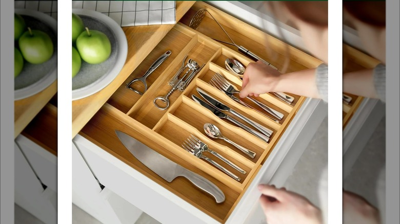 A huge reason for that is the organizer is adjustable in width from 13 inches to more than 19 inches, making it fit seamlessly and completely in pretty much any drawer. Customers also appreciate the fact that there are a number of compartments that are deep enough that everything stays exactly where it's put, and it's also easier to clean than you might expect. It also gets frequent shout-outs for having a beautiful natural wood color that's a serious upgrade from plastic trays, and for being sturdy enough to effortlessly stay in place — which is huge, considering how often you open and close cutlery drawers.