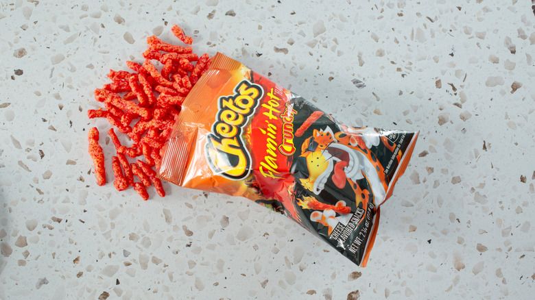 Traditional Rice Krispies treats are great, but if you're craving something a little more jazzed-up (and fiery), swap out the cereal for spicy chips. Think Flamin' Hot Cheetos (the greatest Cheetos of them all), Spicy Nacho Doritos, jalapeño kettle chips — whatever your go-to is when you want a crunchy snack that brings the heat. If spicy snacks are up your alley, this one's for you. This is a painfully easy snack to create.