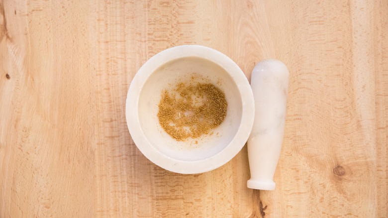 - Grind the cumin seeds with a mortar and pestle. Set aside.