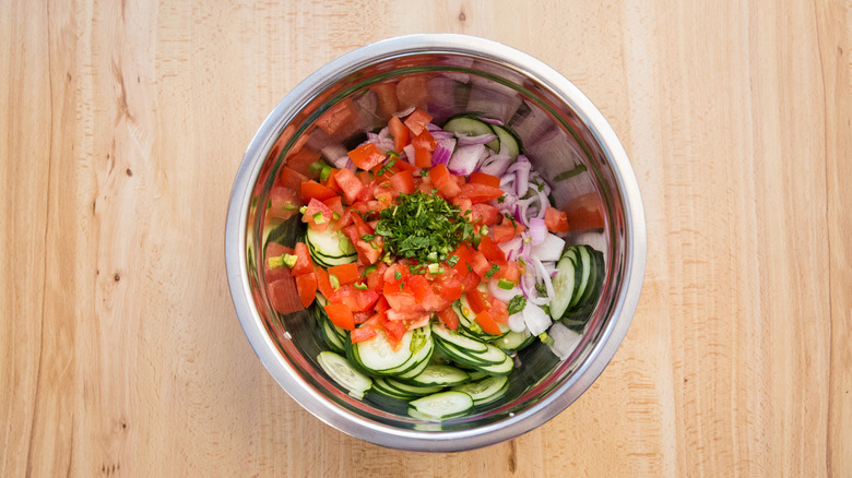 - Place the cucumber, tomato, red onion, green chile, and cilantro in a mixing bowl.