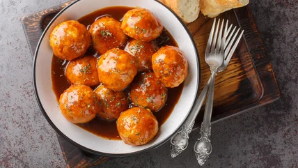 With a few more ingredients, you can enjoy the classic taste of a honey bourbon glaze. Add these meatballs to a spread of mac and cheese, potato salad, and coleslaw, and you have all the vibes of a barbecue lunch without the need to turn on the grill.