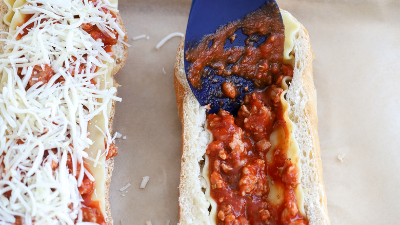 Whether you're planning a meatless Monday and have your heart set on vegan lasagna or prefer your recipes to be packed with meat, hollowing out pieces of garlic bread to use as a base to layer ingredients is the kind of effort that is guaranteed to be worth the wait. Instead of sopping up every last morsel on your dinner plate with a toasty piece of garlic bread, the bread itself will be the vessel for the cheeses, sauce, and seasoned vegetables you choose. These boats of deliciousness are ideal to offer diners as individual portion sizes or to slice and serve for a pre-game treat. If you want to go all out, you can add lasagna garlic knots to the spread to give revelers their choice of cheesy, garlicky goodness to fill their bellies and keep the dinner party hopping.