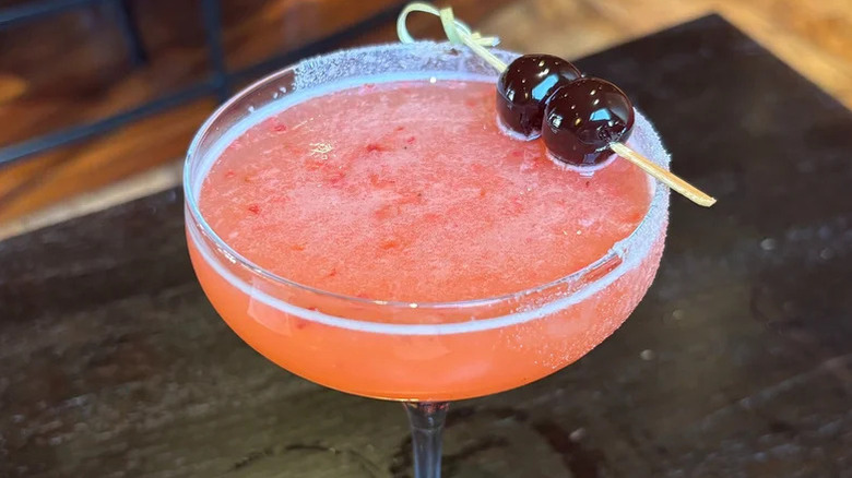 Made with a mix of Hendrick's gin, St-Germain elderflower liqueur, strawberry puree, lychee syrup, lemon, and pineapple juice, the concoction is poured neatly into a glass that has been lined with sugar crystals. The result is a juicy, fruity beverage that goes down easily, particularly during the hottest months of the year. A cute garnish made with speared Luxardo maraschino cherries finishes this drink order, and we are left with no notes.
