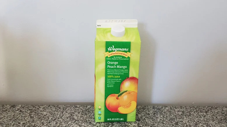 Closer inspection reveals that Wegmans' orange peach mango juice blend also includes apple, white grape, and lemon fruit juices, along with the peach and mango purees and orange juice listed on the label. The product doesn't contain artificial colors, flavors, or preservatives and is made up of 100% juice from concentrate with other natural flavors. The pasteurized product needs to be kept in the fridge, and once opened, should be consumed within 10 days.