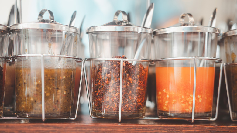 Many Thai restaurants will have a little basket on the table that contains four condiments. They usually represent four main flavors, making it a bit easier to remember what each one is. There's typically sugar for sweetness, chili flakes or paste for spice, chili- and garlic-infused vinegar for sour, and a variant of fish sauce for saltiness. You can then use each of these to balance the flavors of your dish to your liking. Besides these four, you'll also encounter a range of different homemade chili sauces, known as nam prik. These can all vary in terms of ingredients, including regional varieties, and recipes that are tailored to specific dishes, like fish or barbecued meats. It's always worth testing out new condiments; however, it's best to try a small amount first to make sure you like the flavor and can handle the heat.