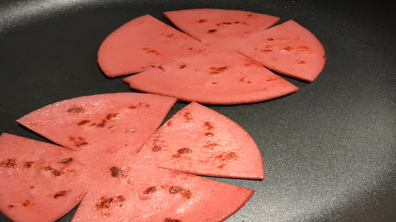 While pre-sliced bologna is convenient, slicing your own from a large chub gives you heaps more flexibility. For example, you can slice it into thicker rounds for a meatier sandwich, chop it into chunky matchsticks to toss into omelets, or dice it into small bite-sized nuggets for snacking on. In fact, diced and fried bologna makes great finger food for summer parties. All you need to do is lightly fry the chunks before coating them in a homemade sweet and tangy glaze or store-bought bottle of barbecue sauce. Finally, spear some cocktail sticks through each piece to make handheld appetizers that are rich in savory umami flavor.