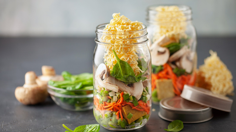 Ramen is arguably one the easiest meals to prepare. But, what if someone told you it could be even easier? As Miriam Hahn's recipe for meal prep-friendly ramen jars, it's possible as long as you have a Mason jar and a packet of noodles. Adding any of the sauce it may have come with to the bottom of a Mason jar, or discarding it completely and making your own, all you have to do is throw your choice of vegetables into the jar along with the noodles themselves before securing the lid and setting it in the fridge. Later on, just pull the jar out and add boiling water.