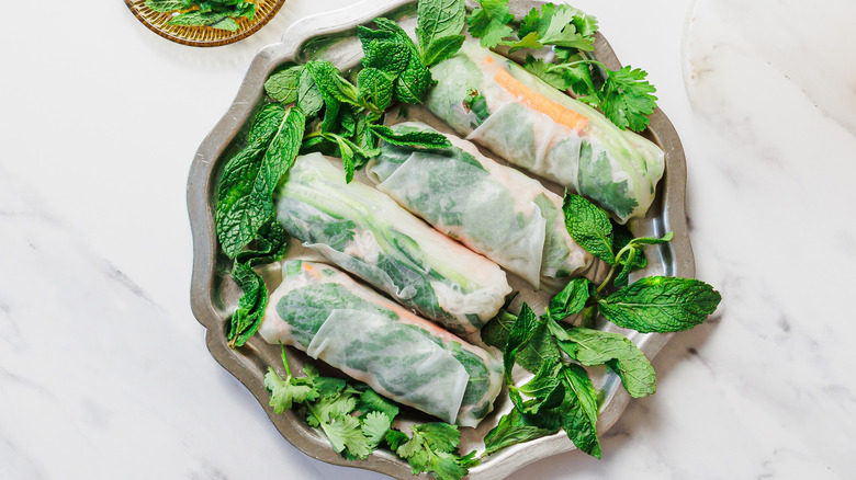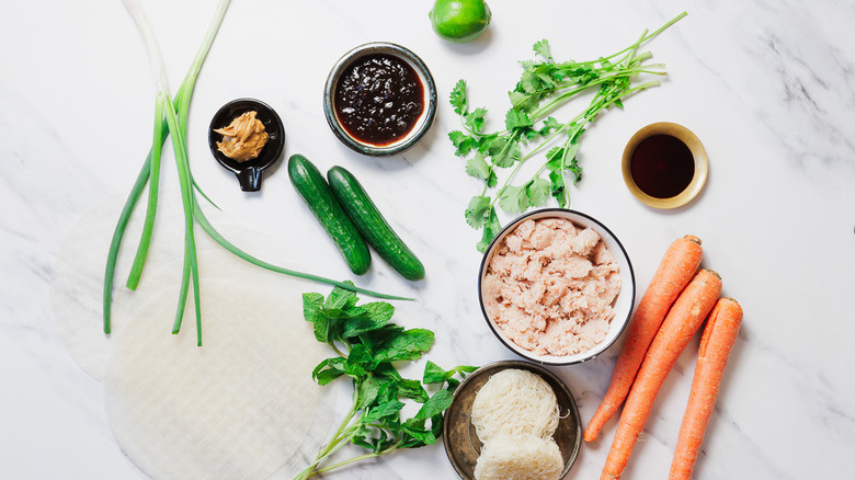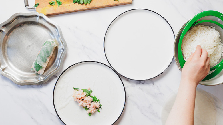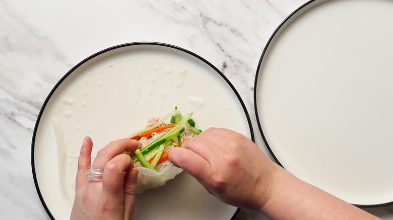 - Lay the wrapper flat on a work surface and arrange a small amount of crab, cucumber, carrot, herbs, noodles, and scallions near one edge.