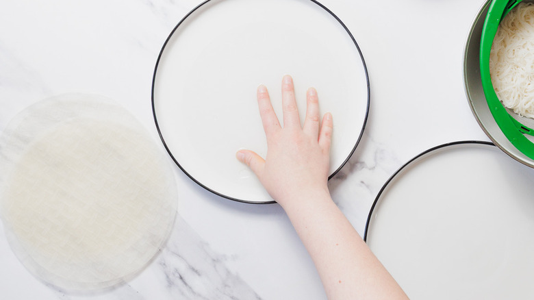 After soaking, lay the wrapper on a large plate or a damp kitchen towel. Avoid sticky cutting boards, and don't stack wet wrappers on top of each other. Work on rolls one at a time, and try to have them not touching for the first 10 minutes, just until they dry up slightly. If you're short on space, place lightly dampened towels between the individual rolls to prevent sticking.