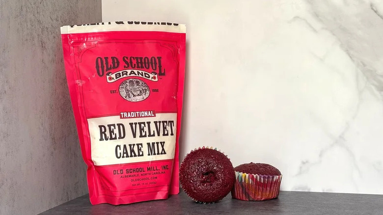 While the baking instructions of Old School Brand's red velvet are specifically for making a loaf cake, similar to a breakfast bread, when making the mix, you can get creative and depart from the pack's instructions. Prepare the cake batter and transfer it to a cupcake tin, bundt pan, or round cake pans for more traditional takes on the cake. Just reduce the bake time as needed, and know that it's done when a toothpick inserted into the center comes out clean. For flavor twists on the mix, substitute regular dairy milk with buttermilk to reflect the tangy liquid ingredient used in many home recipes. Or add some spices to the mix to spruce up boxed cake mix like Duff Goldman does, before baking, cooling, and covering the cake in cream cheese frosting.