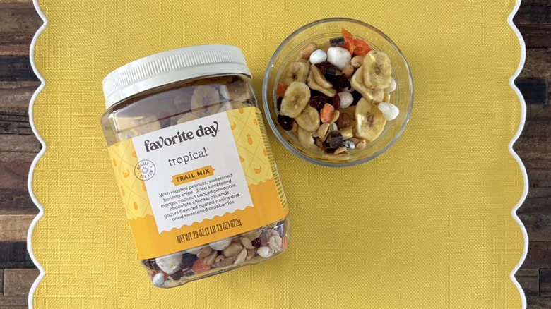 When it comes to timeless snacks, trail mix is absolutely on that list. Why? Well, it can appease the sweetest and saltiest of palates. It's the perfect road trip snack or mid-day treat for both adults and children. And it's one of the few snacks you can make at home or buy at the local supermarket, and both versions will taste equally delicious. Plus, you'll have better control of the flavors when you make it at home. Just remember to use the freshest ingredients when making your trail mix. Otherwise, you'll end up with an array of off-putting flavors and textures that are less than appetizing. Unfortunately, you can also run into this problem with store-bought trail mix. Although there are plenty of phenomenal pre-packed trail mixes, there are also a few duds that will make you regret your purchase. A great example of that is Favorite Day's tropical trail mix.