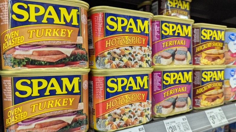 Kebabs became a retro culinary trend, much like savory gelatin molds or fondue. We have plenty of kebab tips for making them if they're new to you. Spam's official website leans heavily into the retro vibe of Spam kebabs and offers a few recipes. These feature staples like pineapple chunks, onion pieces, and a pineapple glaze. If you're a fan of the fried pink meat with your breakfast, a particular one of Spam's many flavors, or just want to experiment with cooking Spam, this is a great way to do it. Just remember that Spam is a very salty meat, so a bright sweet contrast really helps. That's why pineapple is so prominent in older recipes. However, sharp ingredients like onion and pepper also work, which are kebab staples.