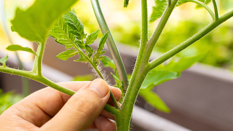 If you have an indeterminate tomato, you need to remove the suckers. Most tomato branches will grow at a near 90-degree angle from the stem. Suckers will grow out of where the branch and stem meet at a near 45-degree angle. Fruit will grow from these suckers, but we don't want this. The plant will essentially try to do too much at once. Instead, you want it to divert its resources to the tomatoes already growing. As you can continually harvest intermediates, this doesn't matter. Pruning or pinching out these suckers will lead to bigger tomatoes.