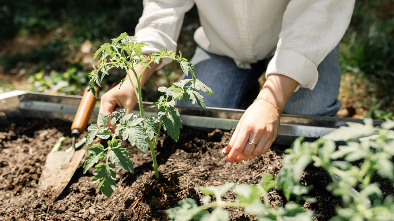 The specific advice here will depend on where you are planting your tomatoes. If you're placing them in a pot, it should be full of compost anyway. You should be using a pot that is at least 15 inches wide to cope with both the heavy needs of a tomato plant, as well as how top-heavy they can get. If you're planting them on the ground, you want them to be surrounded by plenty of healthy soil as using poor quality soil is a common mistake.