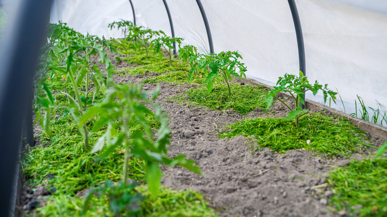 The point of this mulch is that it helps to prevent evaporation. This helps to keep the plant moist so it's constantly getting the nutrients it needs for full growth. If you've ever planted tomatoes before, you'll be surprised by just how quickly they can suck up moisture. As soon as they run out of water, they'll start to wilt. Mulch can help prevent this.