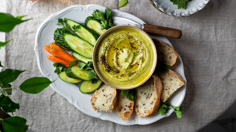 For 1 to 2 pounds of chopped vegetables, start with a clove of garlic and 2 to 3 tablespoons each of oil, lemon juice, and tahini. Extra flavorings like fresh or dried herbs, spices, and grated cheese are also welcome. Blend everything until smooth in a food processor or blender, or for a chunkier texture, blend everything but the vegetables, add them in, and pulse in short bursts until you're satisfied. The resulting smoky, savory dip is amazing with pita chips, crackers, and more fresh veggies. This template is just one idea, though — grilled veggie dip can be anything you want it to be.