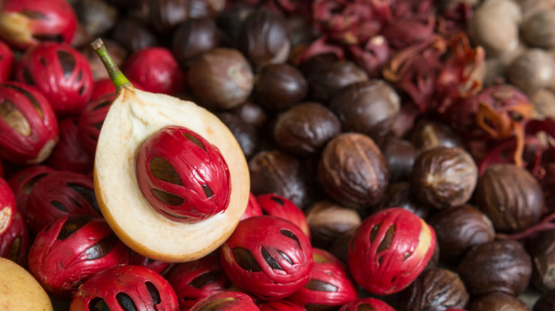 The word "nutmeg" comes from the Latin "nux muscata," meaning "musky nut," but don't let the name fool you: Nutmeg isn't actually a nut. It's a seed that comes from the fruit of the Myristica fragrans, a tropical evergreen tree that can grow up to 40 feet tall. The fruit itself is shaped like a small apricot or peach. When it ripens, it splits open to reveal a glossy brown seed wrapped in a vivid red, lacy covering. The brown seed is nutmeg. The red part surrounding it is mace — no, not the stuff you spray in someone's eyes. This kind of mace is a warm and sweet spice that, when dried and ground up, is used in curry powders and garam masala.