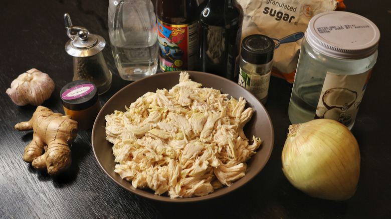 For this recipe you will need coconut oil, onion, garlic, ginger, soy sauce, oyster sauce, turmeric, pepper, bay leaves, sugar, white vinegar, and shredded chicken. Once you have all of these ingredients together, you are only a few minutes from an excellent meal.