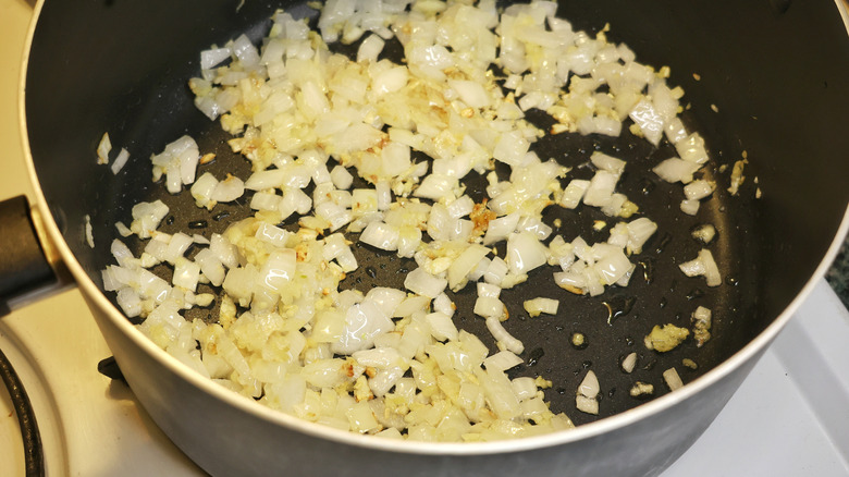 - Add in the onion, garlic, and ginger. Cook the vegetables for around 5 minutes, until softened and nicely fragrant.