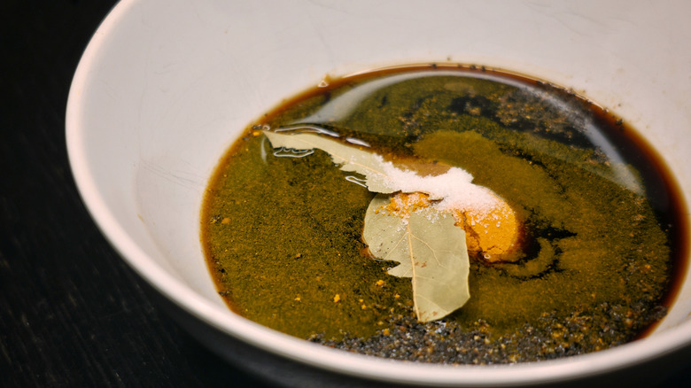 - While the vegetables are cooking, add the soy sauce, oyster sauce, vinegar, turmeric, pepper, sugar, and bay leaf to a bowl. Stir to combine.