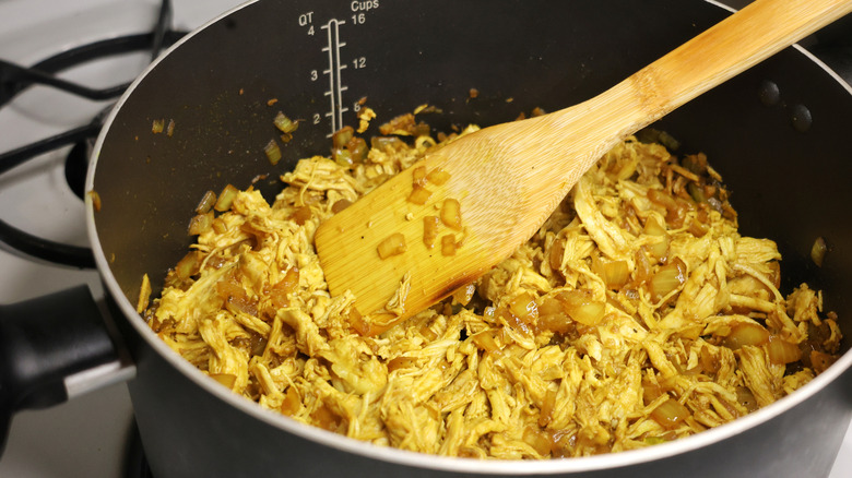 - Add the shredded chicken to the pot, stir to combine, and simmer for 3 minutes, or until warmed through.