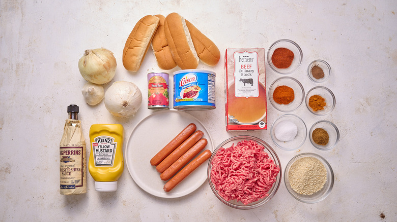 Gather all the necessary ingredients for this recipe before you begin. For the Coney sauce, you'll need vegetable shortening, ground beef, soda crackers such as Saltines, yellow onion, garlic, tomato paste, Worcestershire sauce, yellow mustard, chili powder, paprika, salt, cumin, cayenne, allspice, and beef broth. The crackers offer a similar taste and texture to traditional Coney dogs. The rest of the grocery list for this recipe is fairly straightforward: You'll need additional vegetable shortening, your favorite hot dogs, some soft hot dog buns, white onion, and yellow mustard.