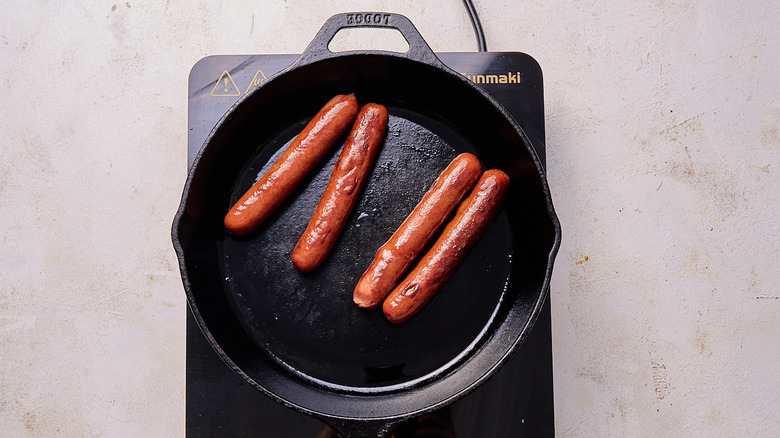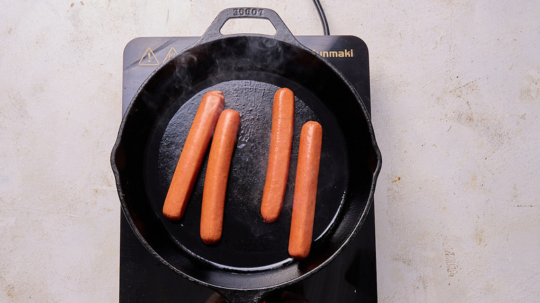- Rotate the hot dogs often until browned, about 10 minutes.