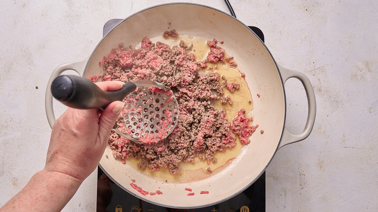 - Add the ground beef. As it cooks, use a potato masher to crumble it into fine pieces.