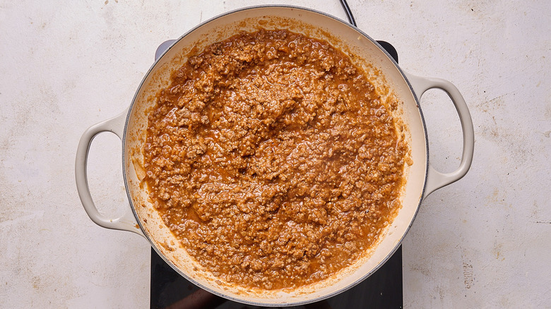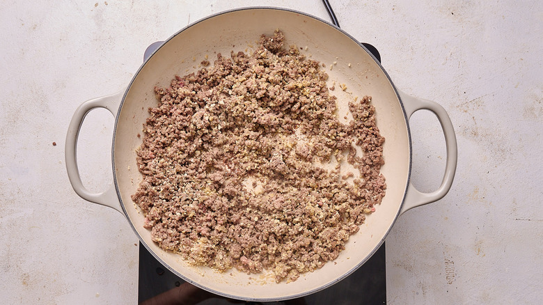 - Once the beef is crumbled and browned, stir in the cracker crumbs.