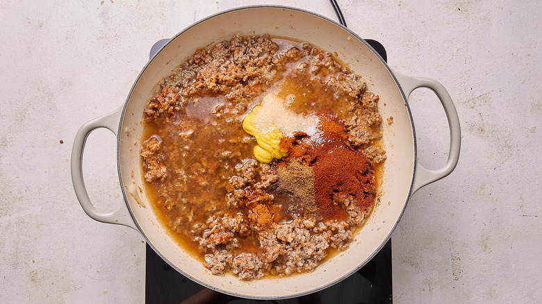 - Put in the Worcestershire sauce, mustard, chili powder, paprika, salt, cumin, cayenne, allspice, and beef broth. Stir to combine and bring to a simmer.