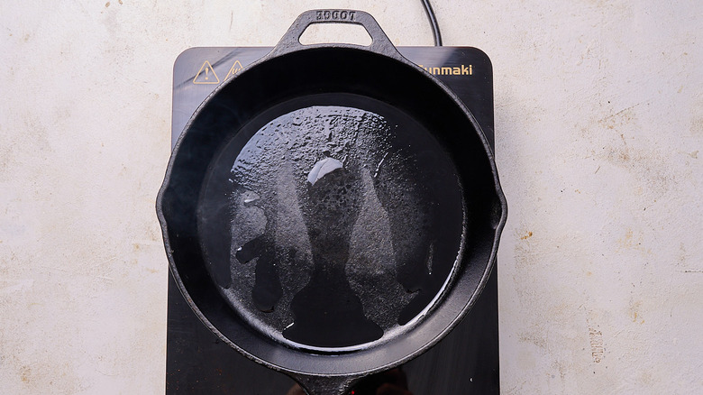 When the Coney sauce is almost done simmering, begin making the hot dogs by heating a grill pan or cast iron skillet over medium heat and adding the vegetable shortening.