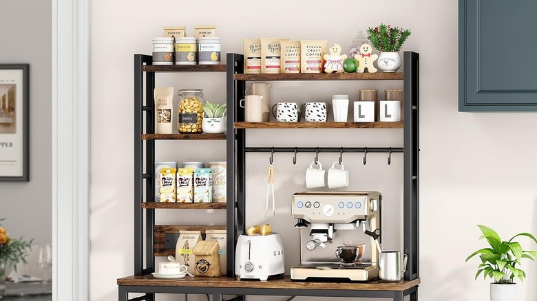 There are tons of baker's racks to choose from, and which you should pick comes down to your needs, budget, and space. If you need a lot more storage and possibly even a place to put your microwave, consider something like this baker's rack from the SNTD store on Amazon, which has three power outlets, 10 wooden shelves, and hooks perfect for utensils or coffee mugs. It would make a perfect place for a coffee bar, freeing up your counters from your coffee maker and all the coffee essentials you keep around it.