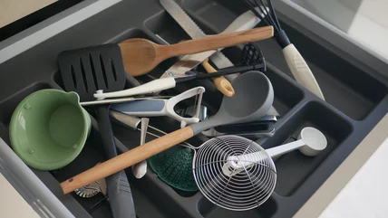 Back to the conundrum of cabinet space: Plenty of shoe racks are small enough for tight spaces, yet have a large impact on decluttering. Vertical cabinet racks easily hold flat items like cutting boards, sheet pans, and plates — or even bulkier individual bakeware pieces. This compact under-shelf shoe rack clips to an existing shelf, perfect for spatulas, wooden spoons, and ladles. Consider placing a compact organizer under the kitchen sink for holding cleaning sprays, gloves, and scrubbers, providing instant reach for unexpected messes.