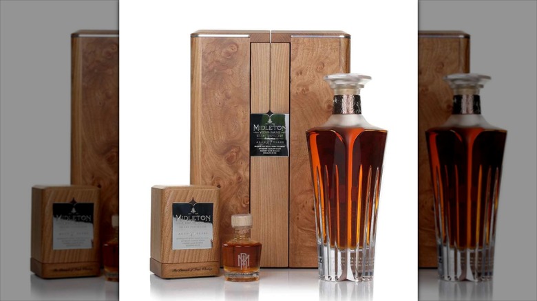 Midleton's Very Rare Silent Distillery Collection is the oldest whiskey collection in Ireland, and it was released in six different editions, which Midleton labeled as chapters. This collection represents the last of the whiskey distilled in the iconic copper kettles of the Old Midleton Distillery, which dates back to 1854. Chapter Three, aged for 47 years and released in 2022, had only 97 bottles produced. The box for each bottle was personally designed by a local craftsman, John Galvin, with elm burr — which is fittingly a form of rare wood — and imbued with nods to the drink's history, with the help of Irish artist David Rooney.