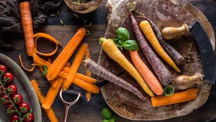 The basic concept for a carrot ribbon salad is similar to a classic carrot slaw recipe or shredded carrot salad, just with veggie ribbons. After you use a veggie peeler to create carrot ribbons, you can play around with taste and texture elements, as well as color. For instance, you can use rainbow carrots for a truly memorable ribbon salad that's high in vitamins, minerals, and antioxidants. From there, experiment with different flavors that pair well with the earthy and slightly sweet carrot salad base.
