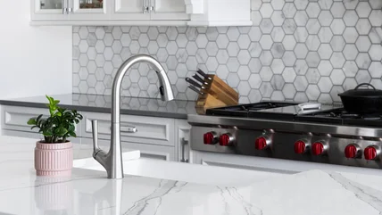 If you are working within a budget, there are several materials that can create an expensive-looking finish, such as laminates that mimic the look of quartz or marble — just one of the many ways you can save money on countertops. With the right finishing touches, such as a statement vase and curated candles, the space around the sink can be transformed without breaking the bank.
