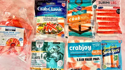 To compile a list for this ranking, I grabbed one of each brand of imitation crab available at a few different stores local to me. You'll see some brand overlap — for example, Trans Ocean had both imitation crab and seafood snackers on this list, and Louis Kemp looks to be the parent company of Crabjoy — but the items were different enough from each other to merit their own spots. This likely isn't a comprehensive list, and there may be brands available near you that I didn't cover.