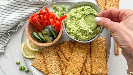 You can whip up this easy five-ingredient hummus in under ten minutes, and we guarantee you'll be impressed by its uniquely fresh and nutty taste. This recipe uses edamame beans in place of the usual chickpeas, which gives the dip a gorgeous green color and slightly sweeter flavor profile. The frozen shelled edamame are first boiled, then blitzed up with lemon juice, tahini, olive oil, garlic, and salt. We love serving it with crisp rounds of cucumber and vibrant bell pepper batons.