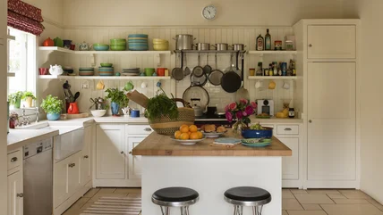 Should this kind of DIY project sound like too much of a commitment, you can look to bring color into the space by using different fabrics on the chairs surrounding the island or by placing vibrant vases and serving trays on the island. These splashes of pigment can serve as inspiration as you decide on the right hue for your project and summon the courage to get painting.