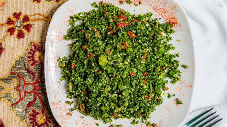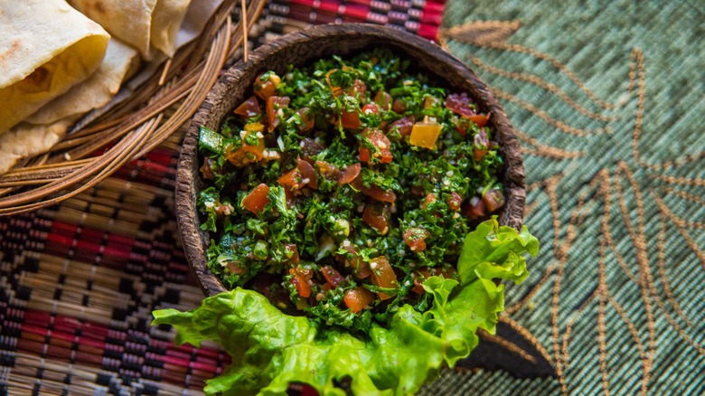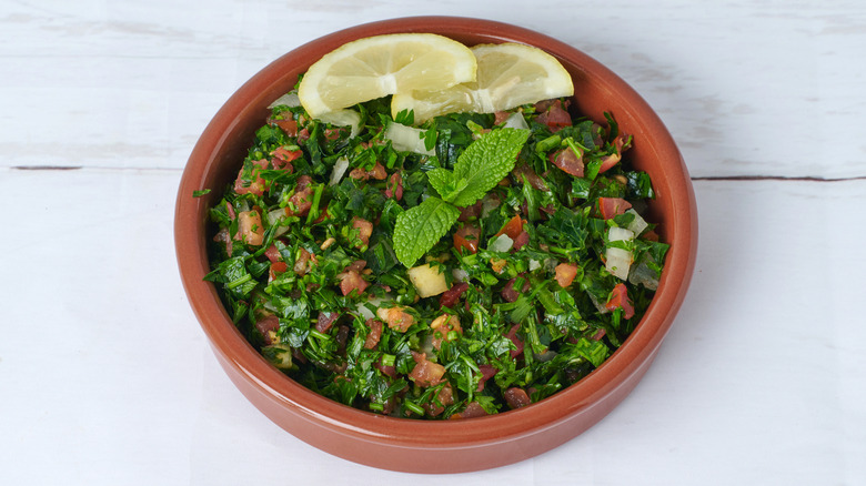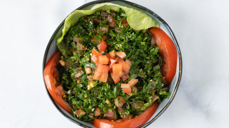 During the hot days of summer, it's a good idea to have a few no-cook meal options up your sleeve. Choosing not to turn on your stove or oven can mean making a lot of salads, but that doesn't have to be boring when you know how to make a salad like tabbouleh. This tangy and fresh salad is bright, bursting with flavor, and unlike other salads you may already have in your repertoire. Popular in Levantine cuisine, this salad is eaten cold, as a mezze side dish or simply on its own. It may look like it has many ingredients, but it only uses a handful, and is easily dressed with some olive oil and lemon juice. While you can always customize the ingredients according to your preferences and what you have available, it's usually made with a base of fresh parsley, tomatoes, and bulgur wheat.
