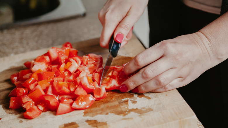 While overripe tomatoes can be sweeter or more intense in flavor, that's not a payoff that's worth having a tabbouleh that's too watery and soft. That's why it's always a good idea to reach for your newer or firmer tomatoes. They give the salad just enough sweetness while still adding to the texture. Some people even recommend removing the tomato seeds and only using the fleshy part, but as a lazy cook (and someone who doesn't like food waste), I don't think this is necessary. Instead, use harder, or just ripe tomatoes, and you can use them whole. Just use a sharp knife and chop them up into relatively small pieces, without pressing down on them as you cut. This way, you won't squeeze out their juice, and they'll stay crisp and juicy in your tabbouleh.