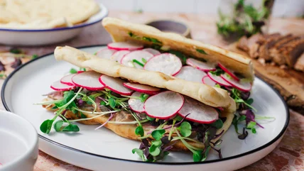 In place of typical sandwich bread, we use flatbreads that are slightly warmed and folded over themselves, so as not to overwhelm the delicate protein. The ahi tuna itself is marinated briefly and then seared for just a couple of moments, leaving it perfectly pink and soft on the inside. For the mayonnaise that accompanies these tuna steaks, we drew inspiration from Japanese ponzu sauce, with its combination of sweet, creamy sauce and toasted sesame aroma. And the crunch element comes from fresh radishes and faintly bitter microgreens. This delicate balance in flavors and contrasts feels almost too good to eat for lunch, yet with this easy recipe, you truly can have it all.