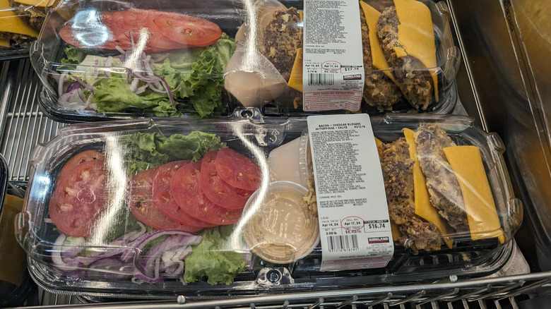 Costco's pre-packed meal kits tend to be a hit among shoppers, but the brand's latest venture in this space seems to be a big miss. Following the introduction of the bacon cheddar burger kits in stores earlier this year, Costco shoppers on Reddit were quick to point out the item's initial flaws. Firstly, commenters pointed out the futility of a make-your-own-burger kit without buns. They also noted the visibly dry texture of the pre-cooked patties, lamenting that they'd rather buy frozen burgers and cook them themselves. And the final nail in this kit's coffin? The veggies already appear wilted even before being exposed to a hot burger patty.