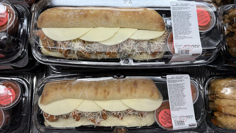 Move over bland deli party sub — Costco's beef and pork meatball sandwich with marinara has entered the chat. The sub of Joey Tribbiani's dreams, this behemoth weighs in at a whopping two-and-a-half to three pounds, packed with between six to eight golf ball-sized meatballs nestled between just as many slices of provolone, all served on an entire loaf of ciabatta-like bread. At around $15 a pop, this mammoth meatball sub easily serves four, making it one of the best Costco prepared foods for a party — or one very hungry family.