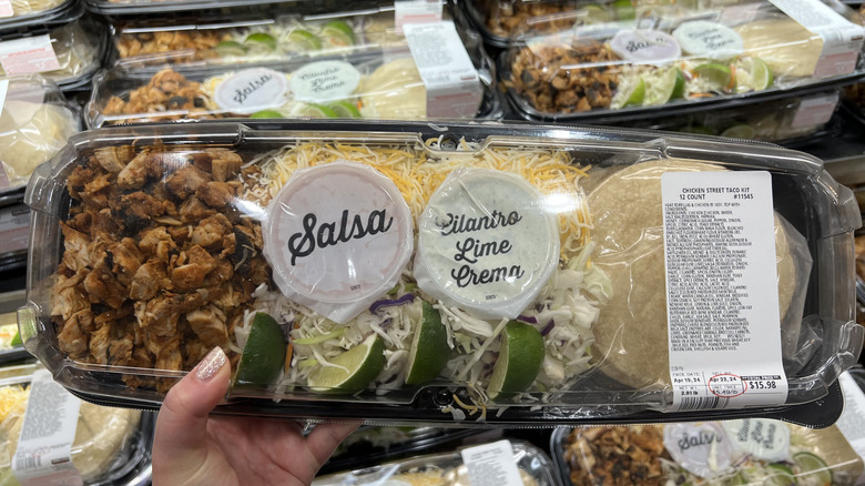 Taco Tuesday just got a whole lot easier. Costco's chicken street taco meal kit covers all the weeknight dinner necessities in one grab-and-go package that's priced just right for budget-conscious shoppers. While pre-cooked meat can be a gamble, this particular taco kit pleasantly surprised this Costco shopper with its hearty portion of juicy chicken flavored with a blend of smoky and not-too-spicy seasonings. Alongside the well-seasoned poultry comes corn tortillas, shredded cheese, shredded cabbage slaw, zesty salsa, and lime cilantro crema — a winning combo that ensures you can build your perfect bite without any extra effort.