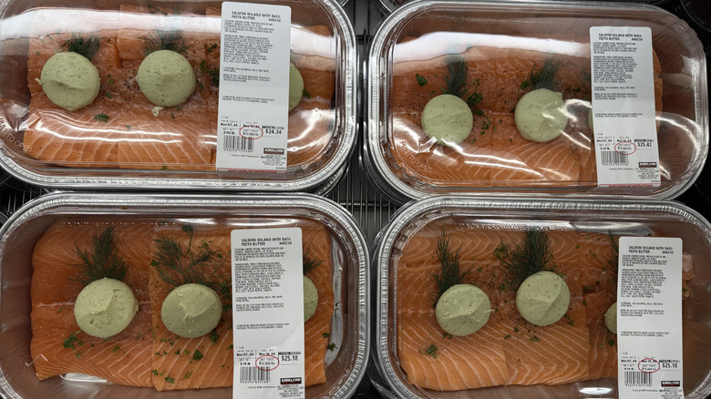 Costco fans praise the dish for its convenience, flavor, and quality, calling the salmon "moist, light, and flaky." The portion size is generous, too, with nearly two pounds of salmon cut into three fillets for a protein-packed meal. The only downside to the dish is the cost. While $11.99 per pound might seem pricy for a piece of fish and some herbed butter, consider the cost of salmon at your local grocery store's fish counter. The price is likely comparable (if not cheaper) and you don't have to decide which seasonings or marinades to use to zhuzh up your fish.
