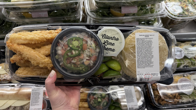 Costco already makes taco night a breeze with its fan-favorite chicken street taco kit, but the grocer recently kicked its Taco Tuesday game up a notch with a new fusion offering. Costco's tempura shrimp taco kits are packed with beautifully fried shrimp and all the fixin's needed to whip up 12 hearty yet refreshing tacos. Retailing at $5.99 per pound (roughly $16-$17 per package), the kit includes everything you need for a flavorful and easy weeknight meal: 12 street taco-size corn tortillas, 12 pieces of crispy tempura shrimp, fresh pico de gallo, shredded cabbage, a generous container of cilantro lime crema, and a few lime wedges for good measure.