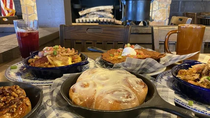 Moving into the desserts portion of Cracker Barrel's fall 2025 menu, customers can choose between two options, each of which is an assemblage of sweet buns in a small skillet. Perhaps the more creative item is the Butter Pecan Sticky Buns, consisting of five sweet dough swirls coated in a butter pecan sauce and praline pecan topping. Like each other butter pecan item on the fall 2025 menu, the Butter Pecan Sticky Buns are debuting at Cracker Barrel as of this promotion.