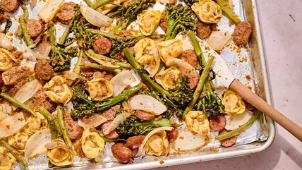 The one-pan recipe, written with developer Michelle McGlinn, requires a few extra steps, but results in a tender, toasted pasta coated with vibrant tomato flavor. To ensure the tortellini is soft and tender with just a touch of browning on the exterior, it's first briefly boiled, then transferred to the sheet pan mid-bake. While the sausage, vegetables, and tortellini roast, a red pesto is blended together and then mixed into the bake, using the tortellini's cooking water to smoothly incorporate. A flavorful pasta dish that comes together on one pan, this Italian sausage and tortellini bake is the perfect way to make busy nights feel like a breeze.